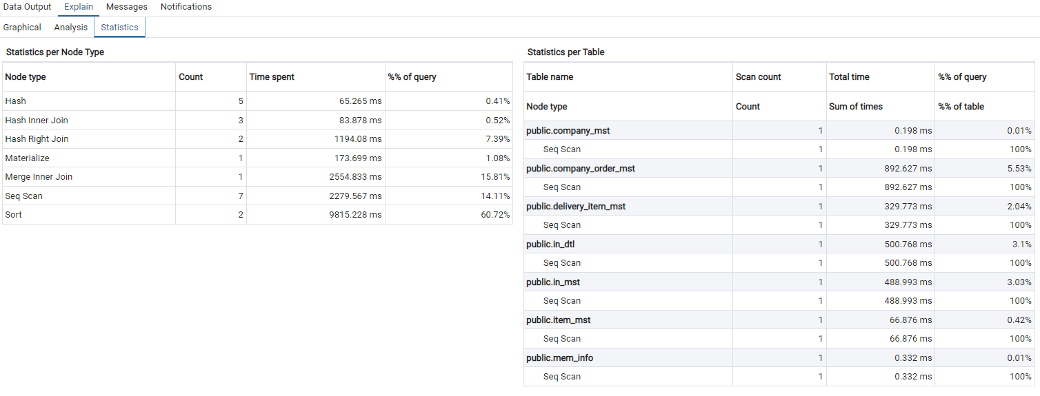 왼쪽의 Statistics per Node Type은 Sort나 Join 등 Table 스캔 외적인 부분이고
